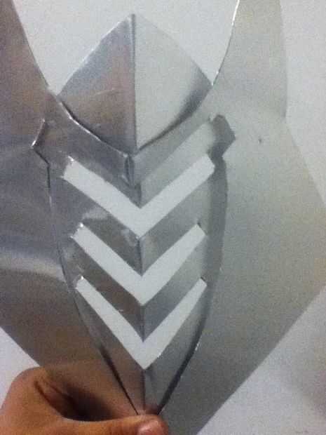 Corte la parte media en la forma anterior. Debe ser capaz de encajar dentro de la pieza de la corona, dejando al menos 1/2 '' entre la parte superior e inferior. Utilice esta parte para trazar otro, ligeramente más grande adentro. Esta pieza debe tener un cuerno que se superpondrá con la máscara. El cuerno debe ser, preferiblemente, la mitad de la altura de los otros dos cuernos frontales, pero otra vez, funcionará cualquier medida. La cinta o la pieza a la máscara de la soldadura.