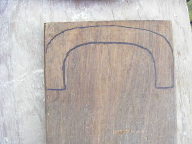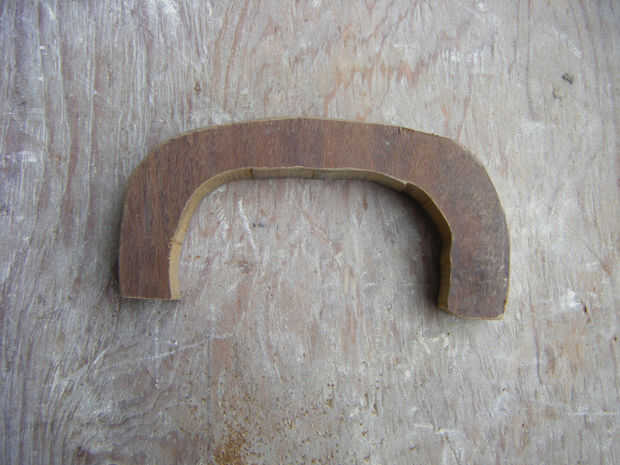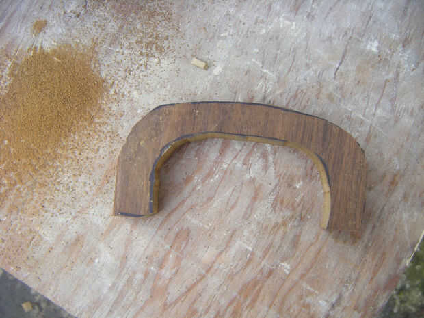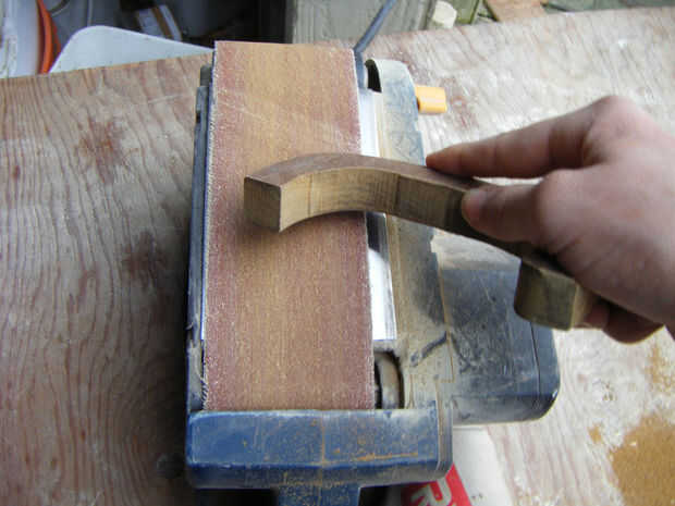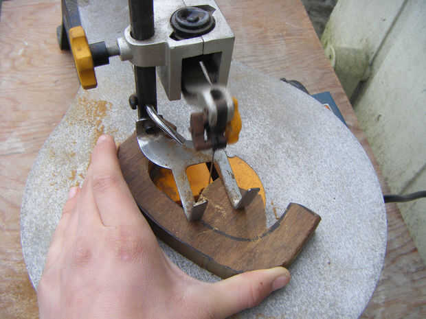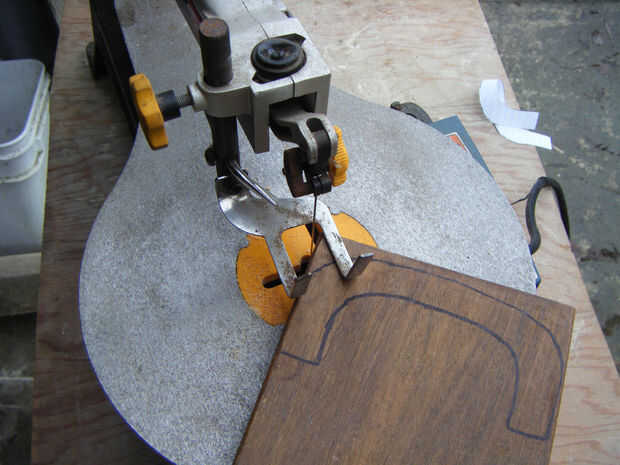 Para la manija de la caja, utilicé madera de 3/4" densamente y utilicé una sierra de contornear para cortar a la forma correcta. Primero dibujaba la plantilla de mango y había trazado sobre la madera. Luego ajuste la sierra a alrededor 1200 y cortar a la forma correcta. Usando una lijadora de mano alisó hacia abajo los bordes ásperos y que podía ver las líneas. Durante el proceso de esta el mango realmente se rompió por la mitad. Esto probablemente no va a suceder a usted pero a mi me pasó porque hubo un nudo en la madera y sólo se rompió por la mitad mientras estaba sujetándolo. Si ves la cinta de enmascarar alrededor de él en cualquier cuadro es por esta razón.