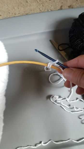 Hacer un deslizamiento la puntada y poner en gancho y fije al aro con punto bajo