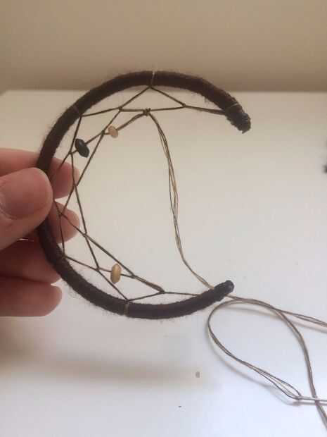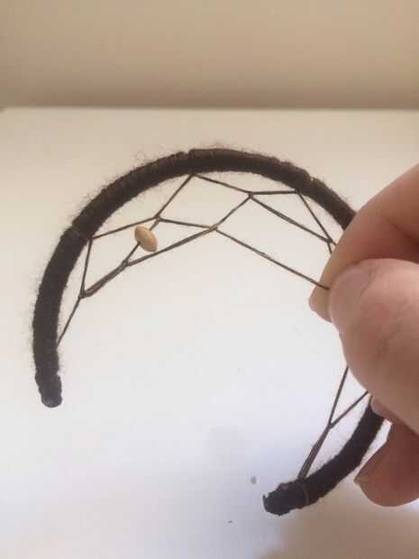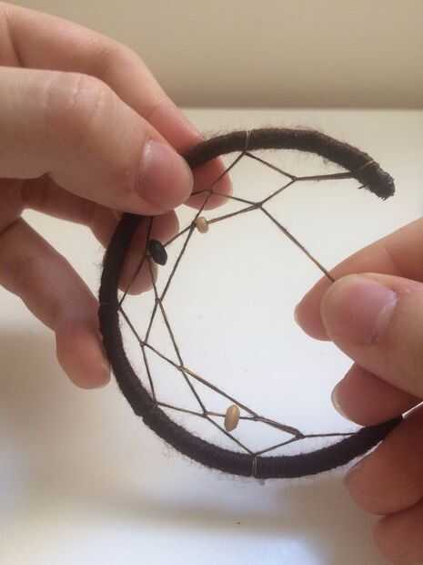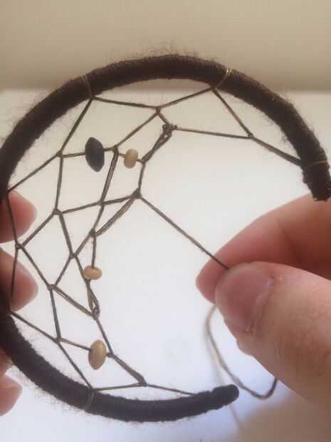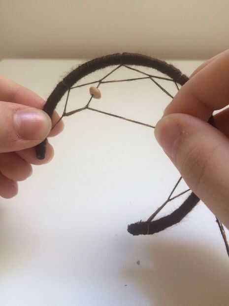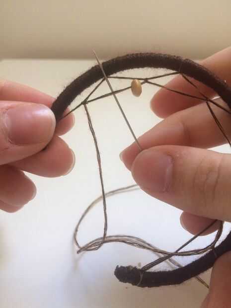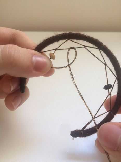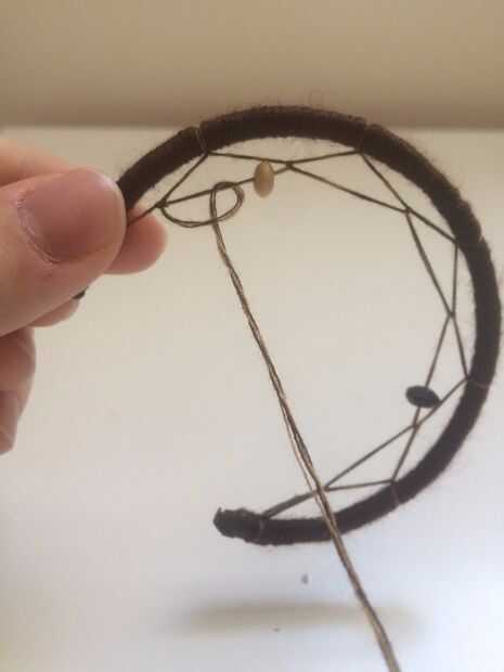 punto el cazador de sueñosPaso 1: Se necesita hilo de elección, ganchillo tamaño F, anillo de madera elección de tamaño, no en imagen plumas y cuentas de la opción.Paso 2: Hacer un deslizamiento la puntada y poner en gancho y fije al aro con punto ba