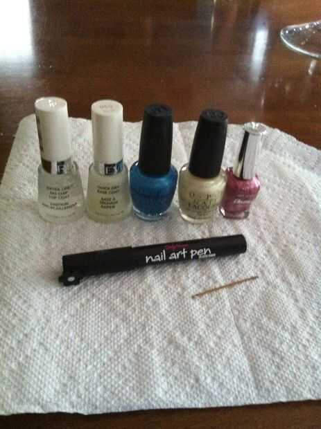 Necesita: 1) negro nail art pen 2) dos diferentes quitaesmaltes (recomiendo un azul turquesa y un rosado) 3) horquilla (esto vamos a utilizar como una herramienta que puntea - si no tienes uno) 4) blanco esmalte de uñas 5) la capa superior y capa base de uñas polaco (opcionales)
