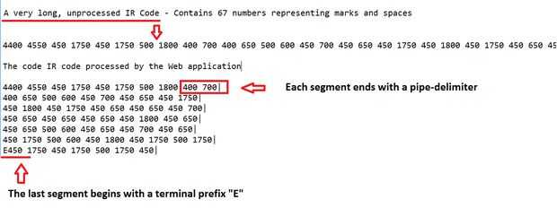 - Romper el código muy largo IR en segmentos de menos de 64 caracteres para permanecer bajo el límite de búfer Serial de Arduino Uno