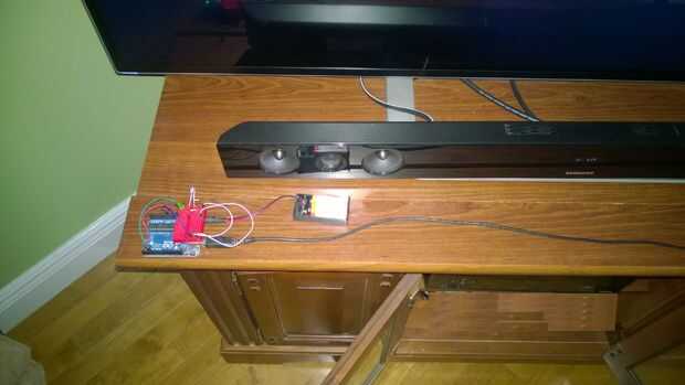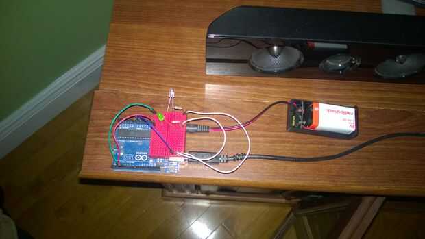 Además, una batería de 9V extra está conectada a la entrada para alimentar suficientemente el LED infrarrojo por lo que puede transmitir el código de infrarrojos en el dispositivo de destino (el monitor LED de Samsung en esta demo) de CC de UNOs