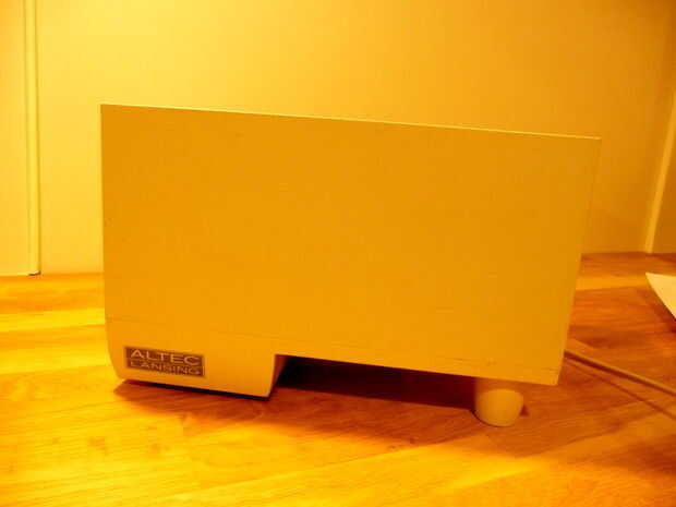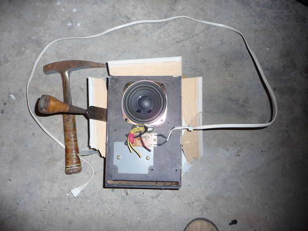 El caso para el sub-woofer es particularmente robusto (tablero de partícula de pegado). Algunos de los orificios estaban ocultos bajo pegatinas... Finalmente recurrí a un martillo y cincel.