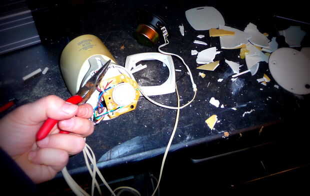Tuve que liberar los componentes de altavoz de sus recintos de época de Pearl Jam. Estos no fueron diseñados para ser desmontado, se llega inevitablemente a un punto donde quitar todos los tornillos no ha proporcionado acceso a piezas que necesita. Puede ser una forma más elegante de hacer esto; pero he encontrado que la mejor forma de atacar esto, es usar alicates y romper piezas de plástico con un movimiento giratorio (gafas de seguridad!). Antes de romper alguna pieza, usted debe considerar si puede ser útil en el camino. Conservado los marcos que me ha permitido montar los altavoces más fácilmente en el Pianorgan.