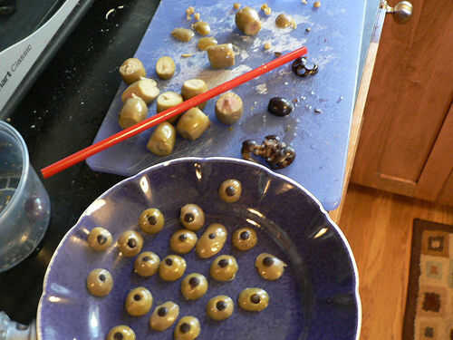 Primeros años simplemente añadí rodajas de aceitunas verdes con pimiento (véase el cuadro 3 en la placa azul).