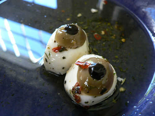 Para ello estoy utilizando una modificación de mi Mozzarella ojo aperitivo (ver figura 2), una bola de mozzarella de corte por la mitad, y colocando el iris y la pupila en la parte superior.
