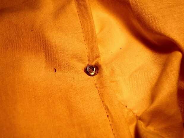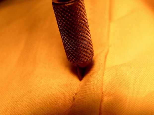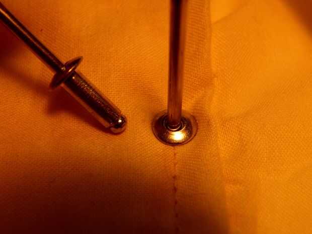 Sus órdenes ser éstos: en primer lugar, poner el borde o ' ye pedazo de círculo o ' vela en la parte superior de o ye tubo y uso pins ter lo sostenga en su lugar. En segundo lugar, os utilizará vosotros X-acto machete ter cortar pequeños agujeros a través de vosotros tubo y círculo. Uso os remache ter mosquete apriete las piezas. En tercer lugar, coser entre los remaches.