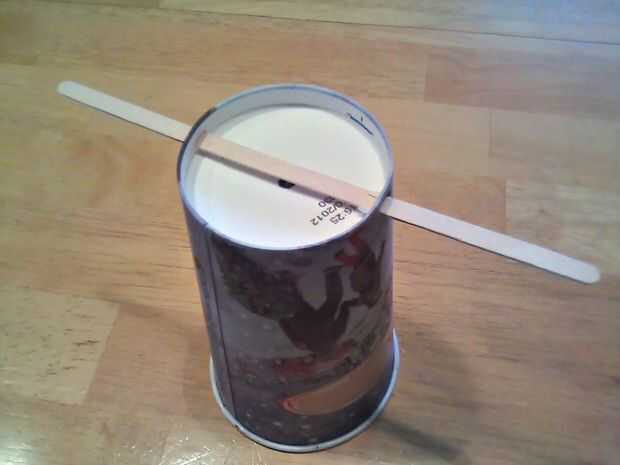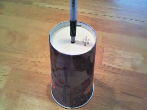 Voltee su taza de café vacía y el palillo de centro sobre el fondo. Que desea marcar las ubicaciones de los 2 pequeños cortes que estará haciendo en la base de la Copa. Desea que estos recortes en el pliegue de papel grueso de la base, no en la parte que contiene el café.