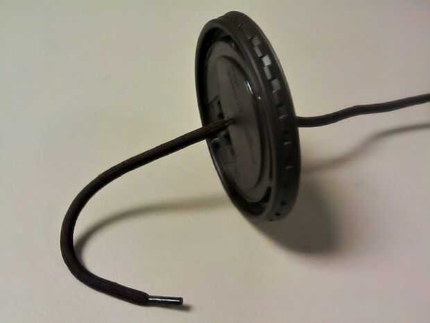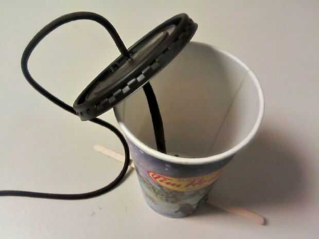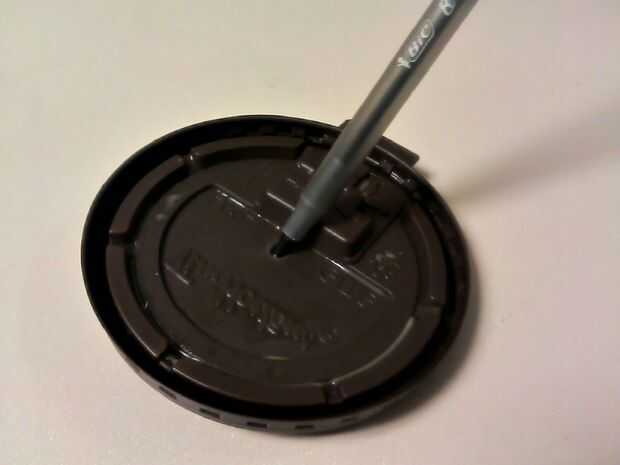 Haga un pequeño agujero en el centro con la punta del lápiz. (En algunos casos un agujero de ventilación está situado allí.) A continuación, empuje la cadena de la taza a través de la parte inferior de la tapa. Tire de la cadena a través de pero deje espacio para poner las semillas de girasol en! Ahora se puede cerrar.