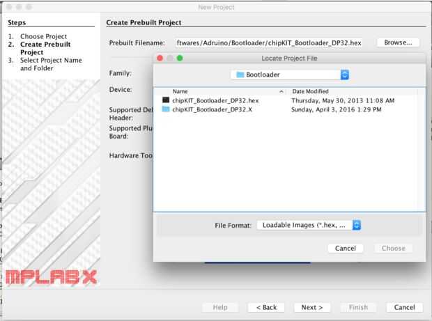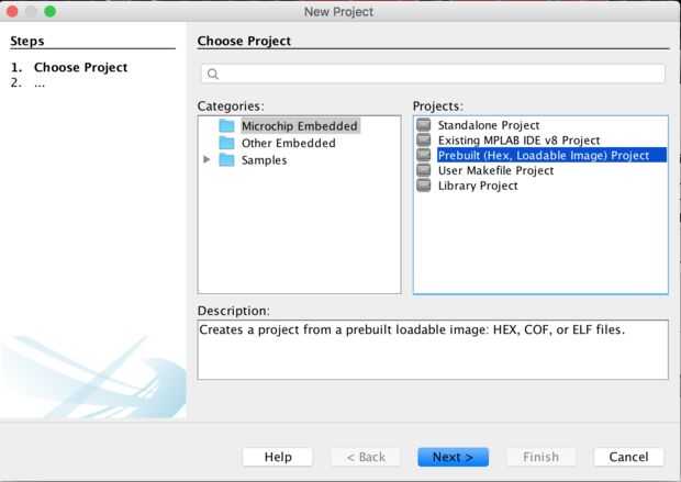 - Seleccione "categorías -> Microchip integrado" y "Proyectos -> proyecto de Prebuilt (Hex, imagen cargable)" y a continuación golpe
