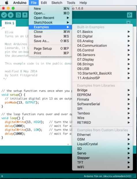 • Puedes ver hay muchos códigos de ejemplo escritos para usted. Ir a "archivo -> ejemplos -> seleccionar lo que quieres"
