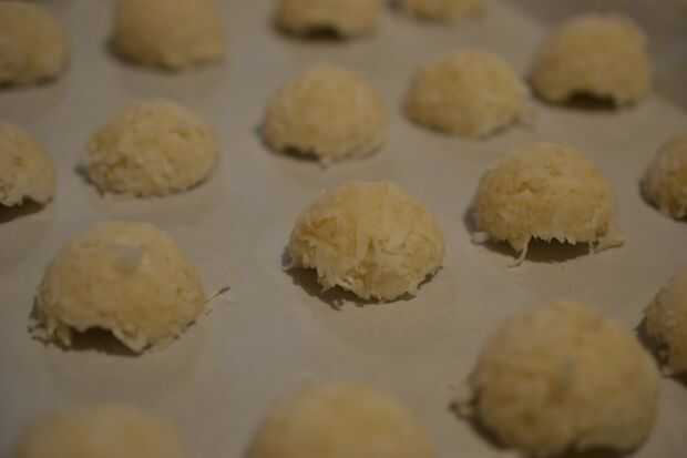 3. Quite los pedazos de coco que parecen medias cúpulas en la bandeja para hornear.