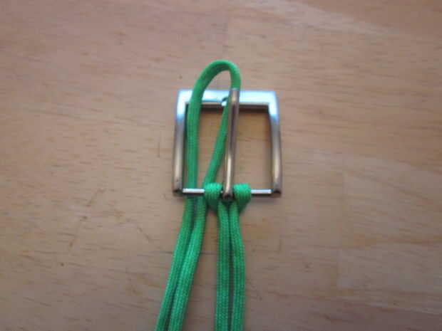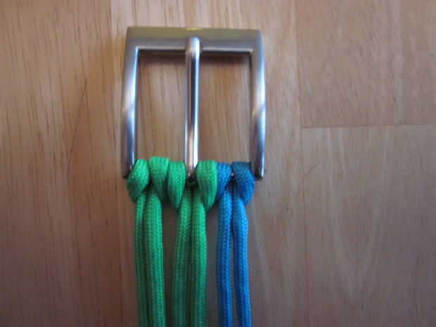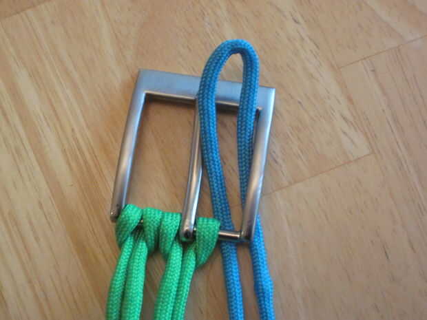 tomar uno de los otros cables y hacer a un lado la misma longitud que el cable de la hebilla y una vaca del enganche y repetir con la tercera cuerda por lo que hay tres enganches en una fila de la vaca.