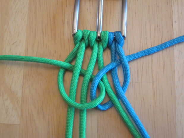 tomar las cuerdas y dividirlos por la mitad, luego tomar el cable externo derecha y lazo debajo de los dos cables internos. Luego tomar la izquierda exterior cable más lazo encima y a través del lazo de la cuerda derecha exterior y apriete los cables.