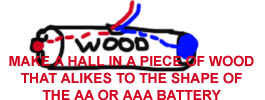 Tome un pedazo de madera y cortarla hasta ser un grupo de la forma del tipo de batería que desee... (AA, AAA) abrir un agujero en el centro de la madera y pasar los 2 cables + y - postes. Al final de cada poli fije un formateo de alambre de bronce - y el + polo.