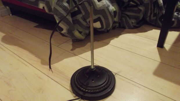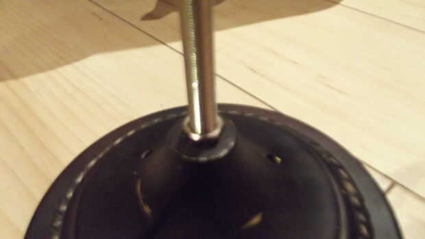 Tomar una varilla de 1 pie y lugar a través del orificio central de la base - asegure con una tuerca en cada lado. Luego, tome el cable (extremo abierto) y pasarlo por el agujero lateral de la base, luego a través de la barra. Debería ver algo como la imagen.