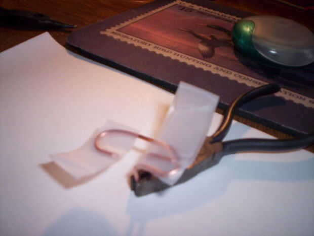 ahora, flip el clip de papel para que la curva es hacia abajo y pone 4" de la cinta, doblado, en lados opuestos de la pieza plana, un trozo de cinta en el lado derecho, mirando hacia fuera. y una pieza a la izquierda, hacia usted.