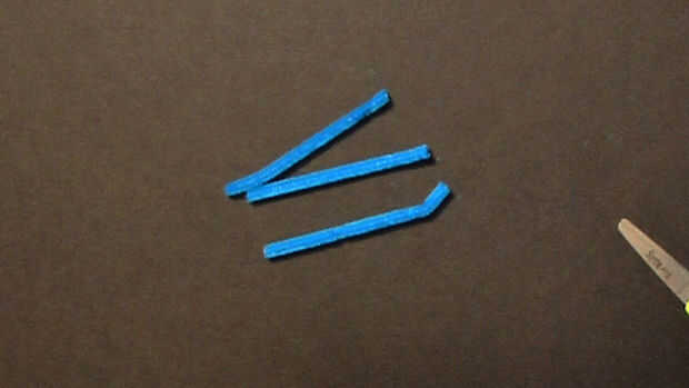 El cepillo de uña que usamos es un poco demasiado estrecho y tiende a volcarse cuando se mueve, así que agregar estabilizadores. Para comenzar, corta el limpiapipas en cuatro 3" piezas.