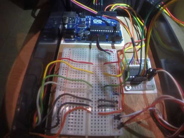 La última pieza electrónica que necesitamos conectar es el receptor de infrarrojos. Esto tiene tres partes que deben conectarse a la protoboard. Una tierra, un positivo y un cable de comunicación conectado directamente en el arduino. Usé el número de puerto serie 6 para dar comandos.