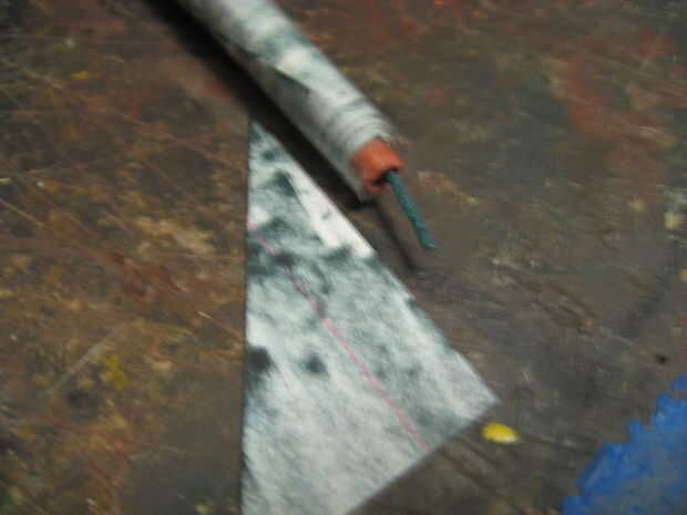 Tome la segunda hoja de notas y cortar las tres piezas del triángulo, asegurándose de que las piezas del triángulo son más largas que la mecha de petardo (Foto 1).