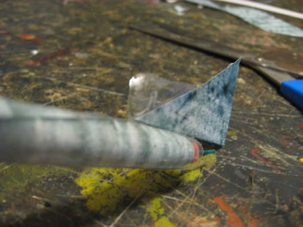 Para sujetar las aletas, cinta de un lado luego añadirlo al cohete. Añadir cinta al otro lado de la aleta para asegurar la aleta al cohete. Utilice su cuchillo de la manía para quitar exceso cinta (Foto 2). Repita este proceso 2 veces más. La segunda aleta necesitará alrededor de 60 grados de la primera y la tercera aleta será 60 grados de las primeras y terceros las aletas del cohete. Pase a 8:27 en el vídeo para más detalles sobre cómo agregar las aletas, así como el proceso de montaje de esta.