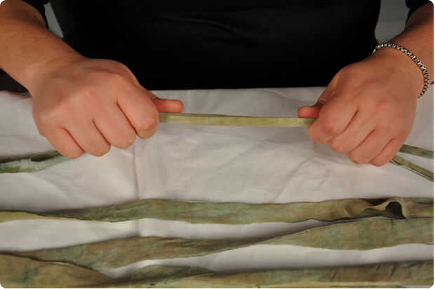 Una vez que las tiras se cortan tomar cada tira uno a la vez y estirarlo. Esto hará que los bordes de rizar, escondiendo los bordes cortados.