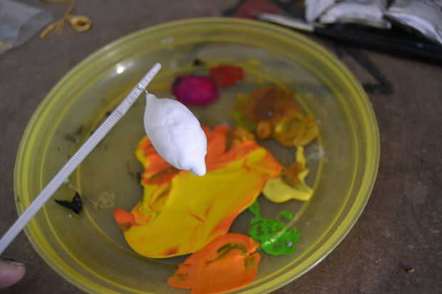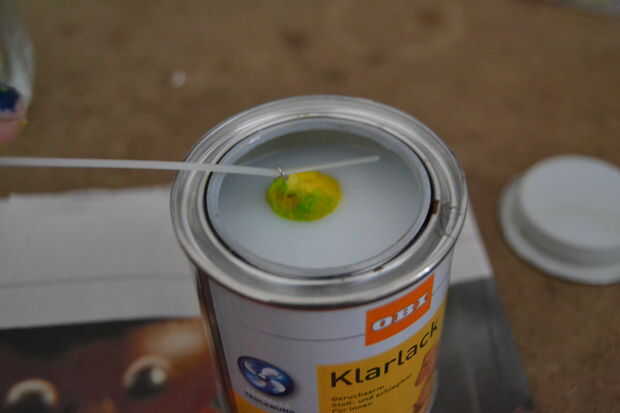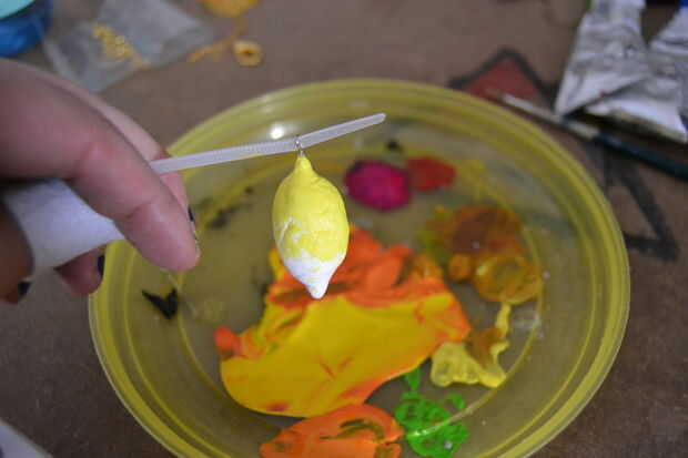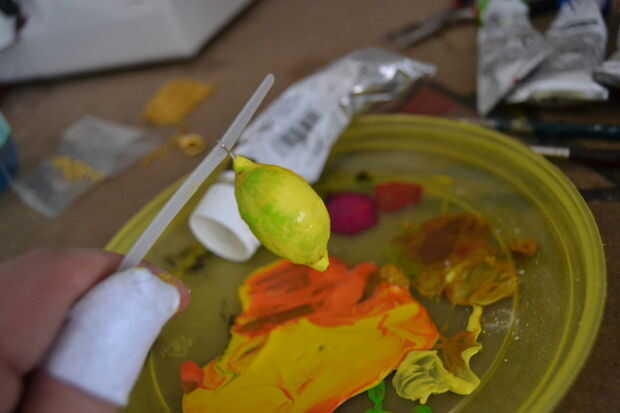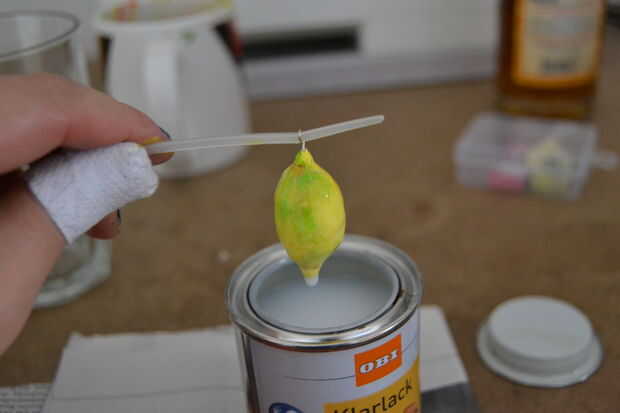 después de la pintura acrílica seca aplicar la capa transparente. me funciono mejor para sumergir la fruta directamente la capa hasta que sumergida completamente. Deje el goteo de exceso de la capa, luego deje que se seque la capa superior. continuar con el resto de la fruta.