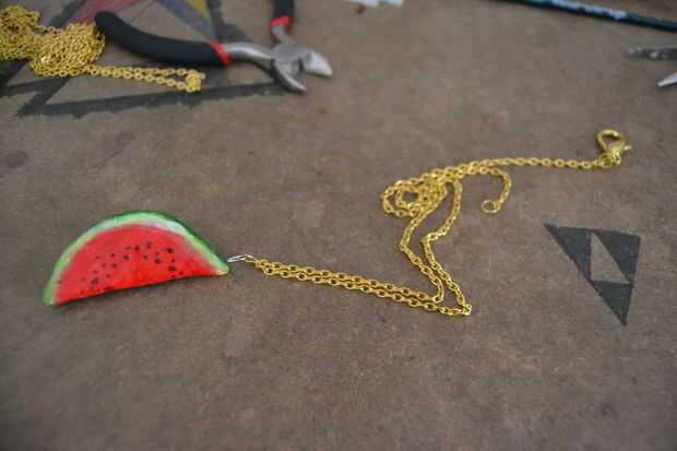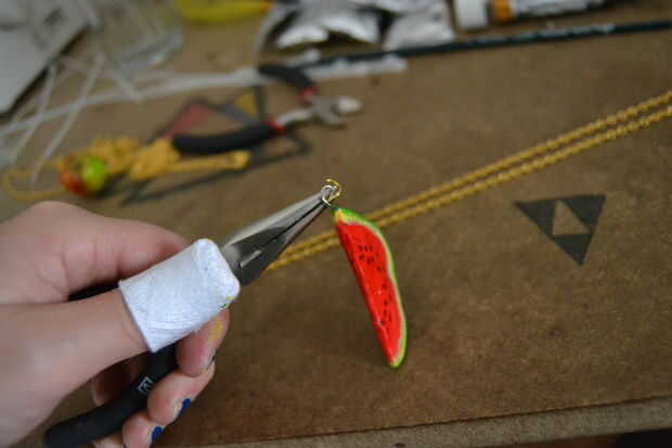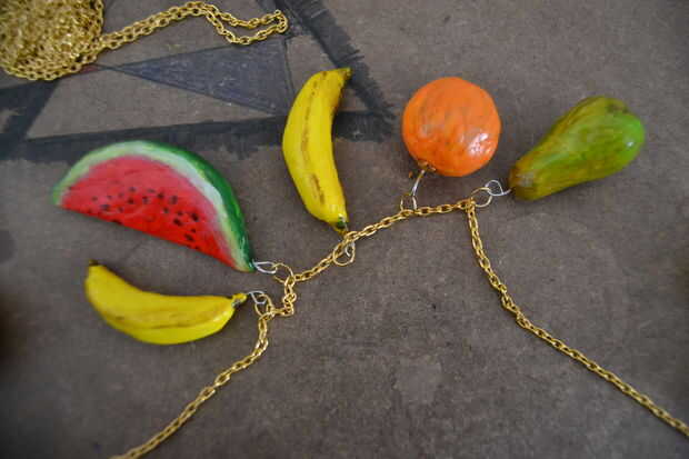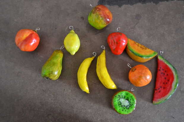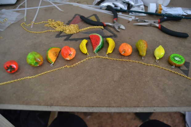 Coloque el resto de la fruta de izquierda y derecha de la fruta del centro usando los anillos de salto. conté los eslabones de la cadena, añadiendo un enlace siempre 7 frutas para tener la fruta a distancias iguales. (antes que el resto de la fruta que he probado en que orden lo harían el mejor conocimiento)