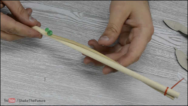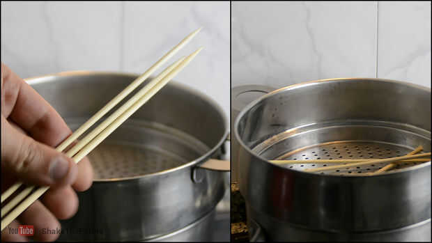 Después de 15 minutos de cocer al vapor, saqué los pinchos y envuelto alrededor de un palo de madera.
