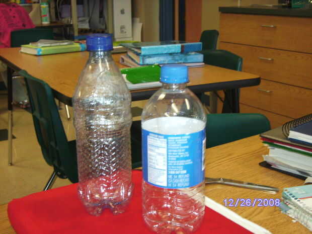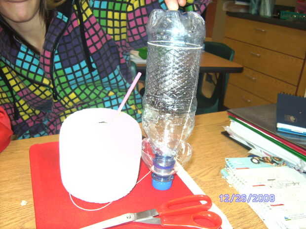 dos botellas de agua, cuerda, cinta, tijeras, lápiz