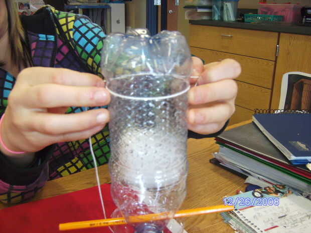poke agujeros en la parte inferior para que la alimentación del pájaro irá a la segunda botella. luego haga dos agujeros en la parte superior y ejecutar el tiro de la cadena y atar de manera que se puede colgar del árbol o donde quiera.