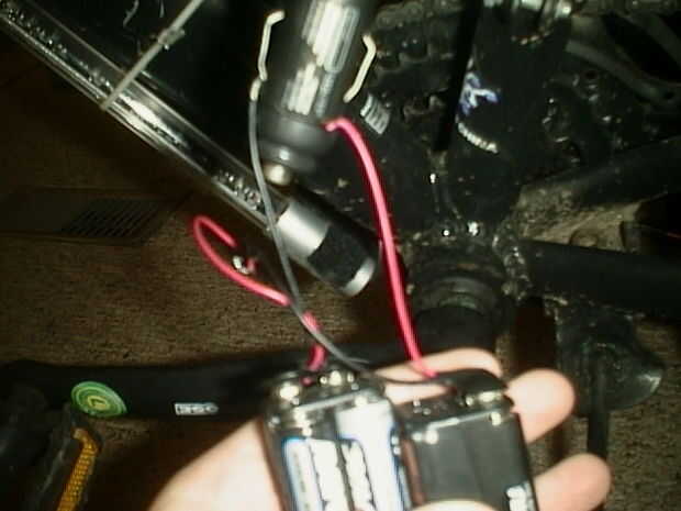 Usando una taza para el paquete de baterías ayuda para la durabilidad del sistema ya que las baterías tienen casi no hay manera de caerse. Puede cortar el adaptador de 12v y tira de los cables o puede dejarlo en y enrolle los cables alrededor de la pinza de tierra y desatornille la punta y el palo el cable rojo hay. Pelar los cables tiene menos posibilidades de un corto que será mucho mejor. También puede cinta las baterías dentro de los titulares y cremallera atarlos debajo de su asiento de bicicleta. No trate de zip atar las pilas a las barras en cualquier lugar en el marco de la bicicleta, no va bien y caen constantemente.