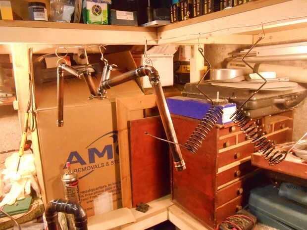 Las piezas colgando arlos brazos de soporte de reloj Nixie y fuente de alimentación después de que habían envejecidos con solución de hígado de azufre, usa esto en la tubería de la lámpara también. Todas las tuberías se frota hacia abajo con la lana de acero y limpiar con Alcohol para eliminar cualquier residuo. Tenga cuidado al usar esta solución ya que es perjudicial y da demasiado de un pong. Usar guantes de goma y tiene un montón de ventilación cuando lo haga.