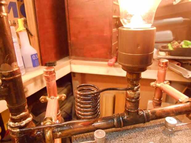 La bobina que puedes ver conectados a la lámpara base es la tubería que fue cabida para el bulbo del termostato y sólo la herida alrededor de un palo de escoba antes de colocar la tubería y base de la lámpara.