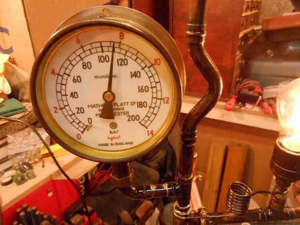 Ninguna lámpara Steampunk precie no sería vista en público sin tener un medidor de presión de gran gran friolera en él en alguna parte y esta no es la excepción! Lo conseguí en Ebay por un tenner y una ganga de hecho. Lo mismo pasa con tener válvulas en él, usted simplemente debe tener una válvula y mejor aún es si realmente hace que la válvula algo! Este cambia la alimentación a los dos exteriores lámparas como lo modifico internamente para tomar un micro miniatura que opera un relé de 12VDC para cambiar los 240VAC.