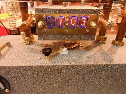 Hice terminales de tornillo de aluminio que no tenía latón y tomaron el poder de la fuente de reloj para los que en la base superior y luego a través de bobinas de cobre procedente de la base de tierra de algún cable de 6mm doble y de la tierra para emparejar terminales en la parte superior del reloj. También hice botones para operar el sistema y ajustar el reloj.