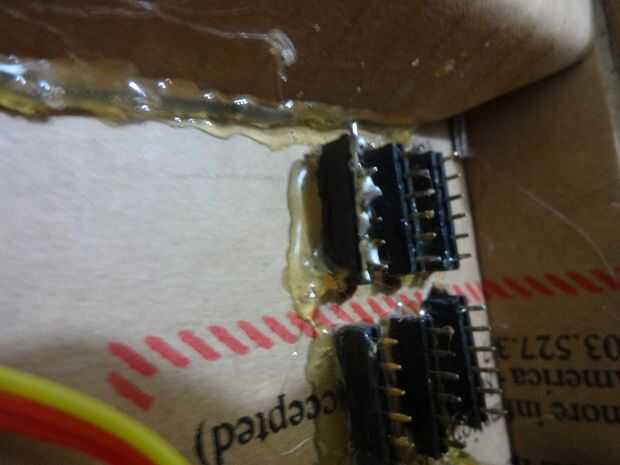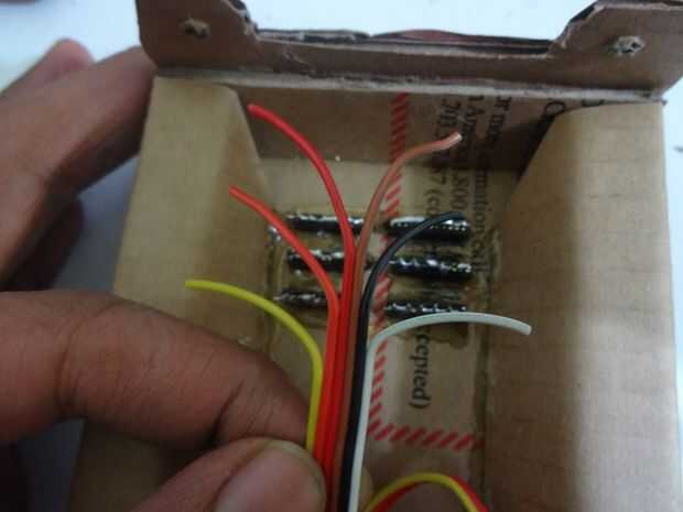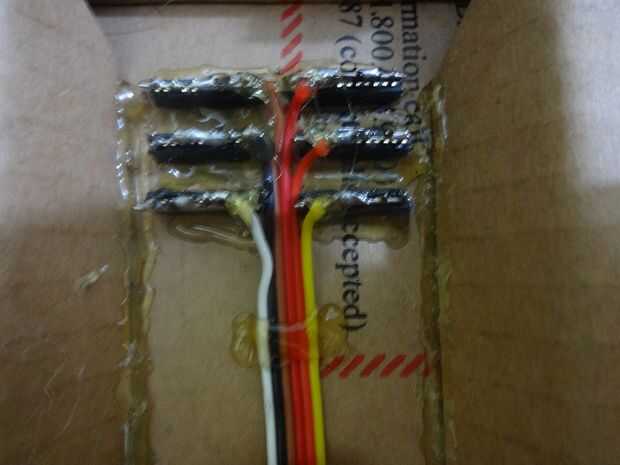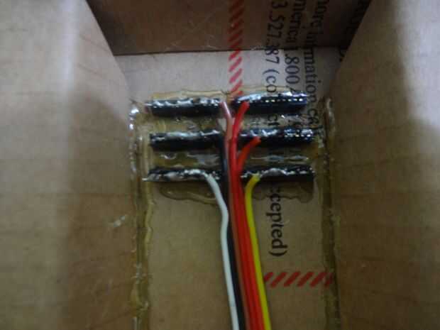 Tomar 6 cable trenzado de cinta, cúbralo de estaño y adjuntarla a cada ranura. Nota que puse colores oscuros para el lado negativo. Aplique pegamento caliente para fijar en su lugar.