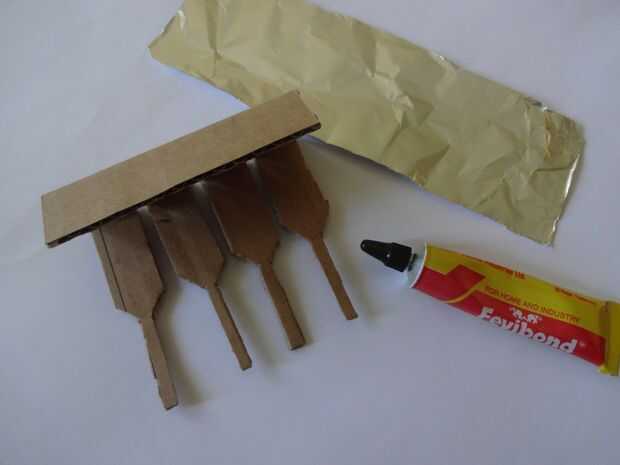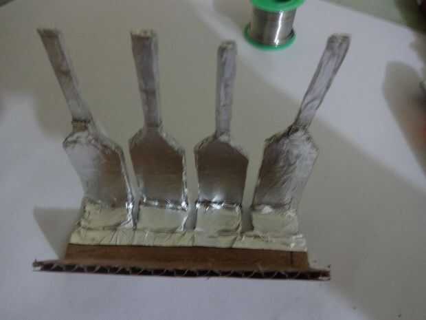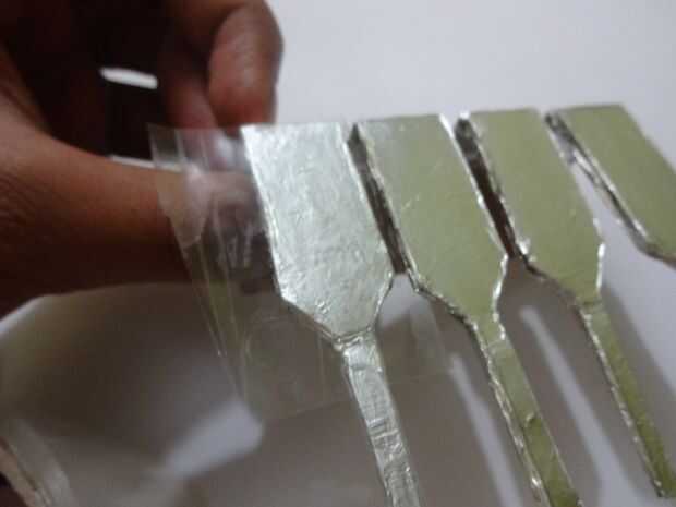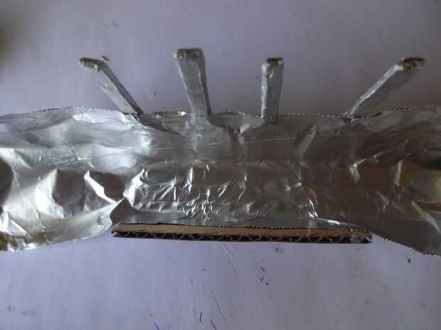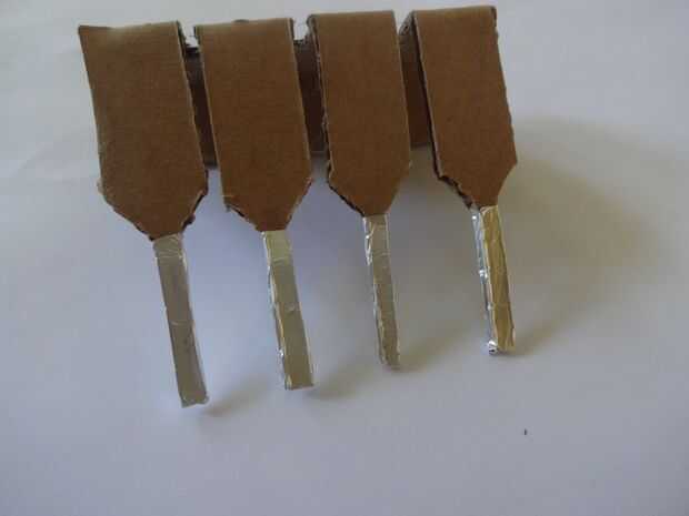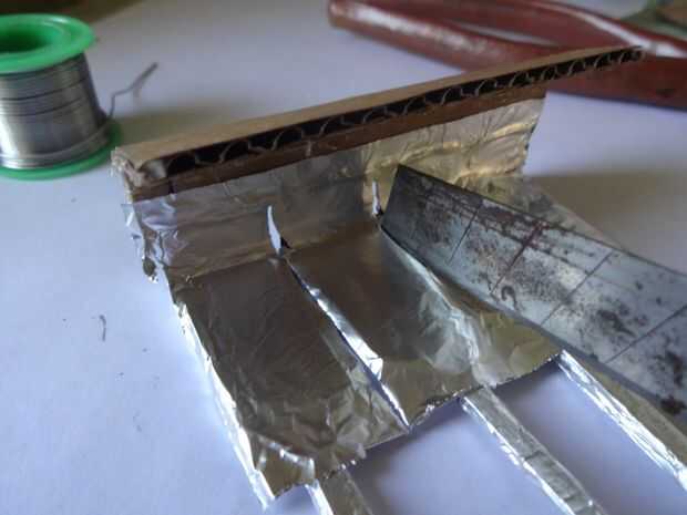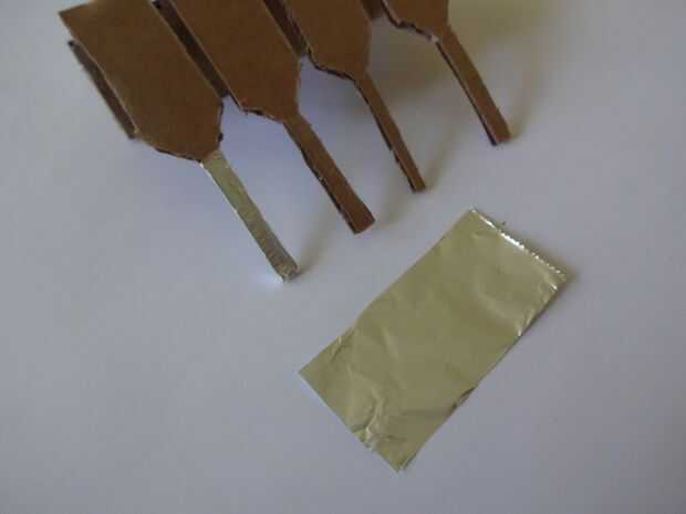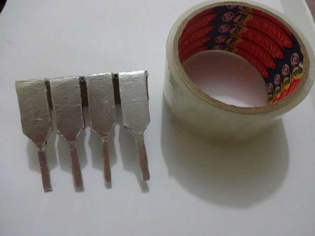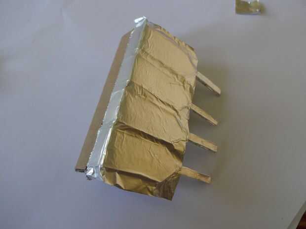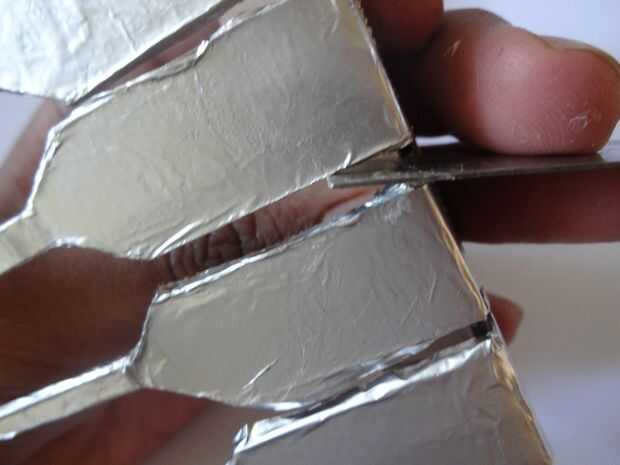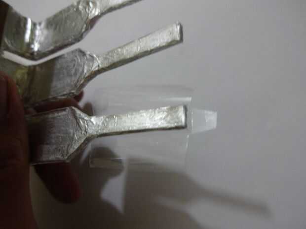 Cortar un trozo de papel de aluminio 1x2inches y pegarlo con cuidado, pliegue por pliegue a los extremos de la pata con algun pegamento de metal de cartón que se pegan. Usé Fevibond.