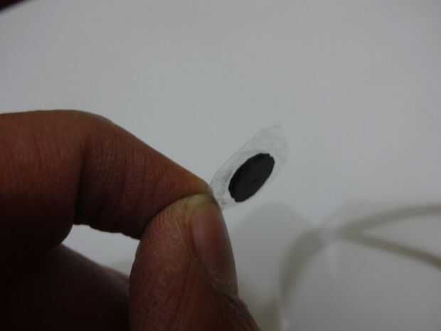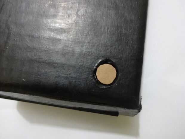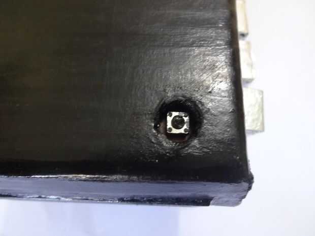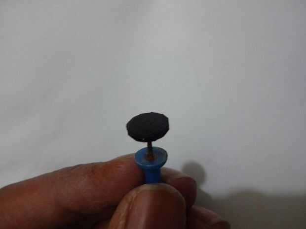 Hacer que el botón con un pequeño trozo de cartón, pintura negra y cubrirla con cinta (le da un acabado brillante). Aplique una pequeña gota de pegamento y pegar el botón en el lugar.
