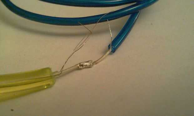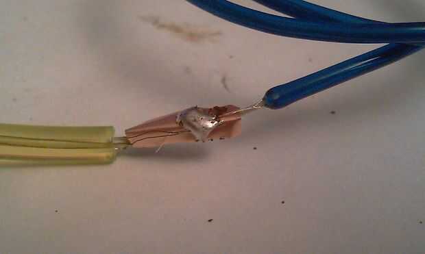 Usted puede hacer esto por separado o Cómo hice fue colocar todos los cuatro cables acostado en la hoja de cobre y luego de soldadura al mismo tiempo. Después permita que la soldadura se enfríe (par de segundos debe hacerlo) envolver con shrink wrap calor y hay su producto terminado.
