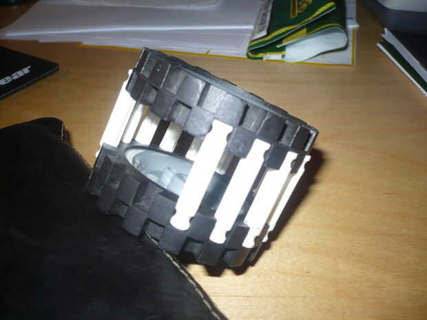 Conecte las 2 ruedas en la foto como se muestra usando 13 de las barras de blanco.