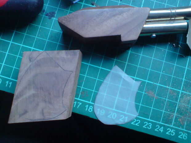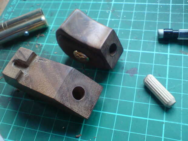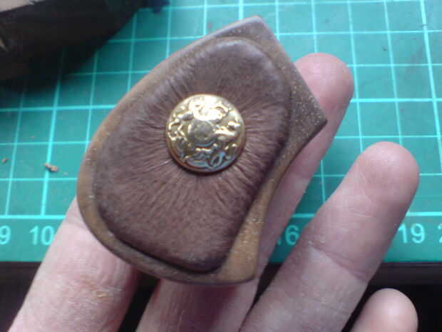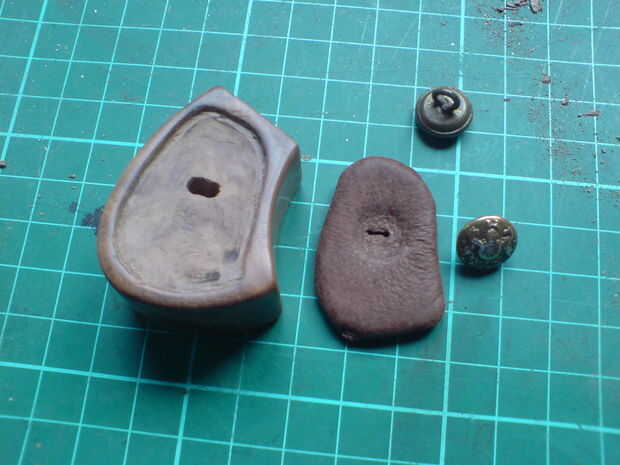 En forma de la empuñadura de nogal más, luego cortar figuras más pequeñas de algunos hoja de corcho. Entonces estos estaban cubiertos con cuero de ropa fina. I luego corte/cincelado/dremeled un hueco en el mango que luego hundió los puños en.