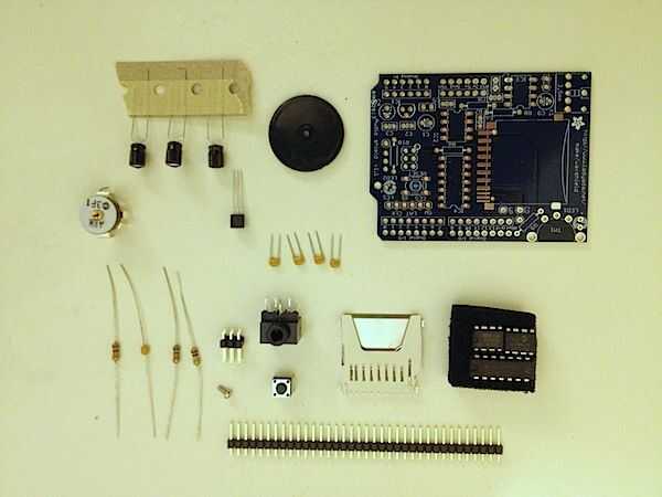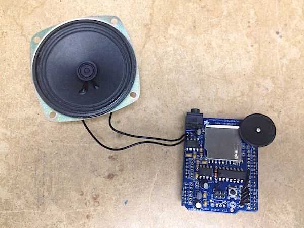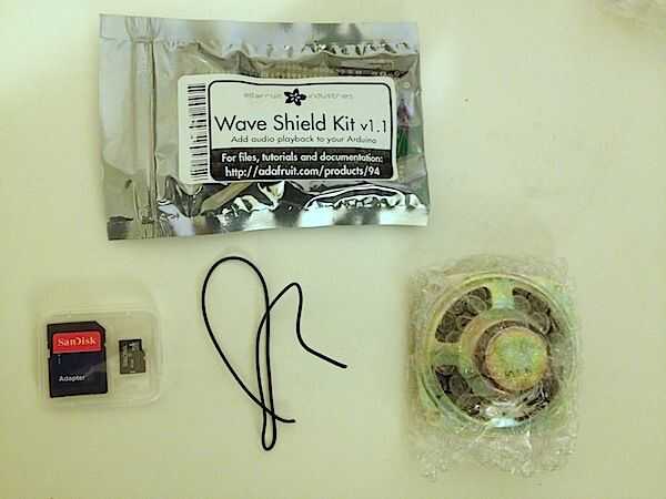 Compré el kit de protector de la onda junto con la tarjeta SD SDHC y un altavoz de 3", pero terminó por no usar ninguno de estos. La biblioteca de AF_Wave utilizada en el código de Arduino para este proyecto sólo funciona con tarjetas SD estándar (no SDHC) y solamente formateada para FAT 16 (no FAT 32). Después de una rápida investigación pude comprar una tarjeta SD estándar en ebay para $2. En cuanto al 3" altavoz, el protector de la onda no era lo suficientemente alto para mí, así que decidí usar en su lugar un Smokey Amp (se usa como un amplificador y un altavoz).