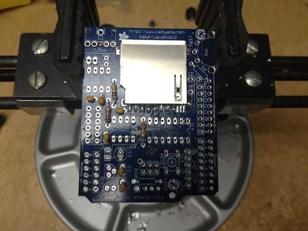 Desembale el Kit de protector de la onda, compruebe si todos los componentes existen, luego soldar todo con estas instrucciones paso a paso. El escudo tiene sólo un componente de montaje superficial - ranura para tarjeta SD, por lo que la soldadura no es demasiado difícil. Si no está familiarizado con el proceso, aquí es un gran instructable sobre este tema.