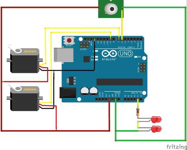 Conecte los cables como sigue: terreno común-al pin GND; Tensión común, al pin de 5V; Señal PIR – al pin 6; 1 señal de servo-pin 7; 2 º señal de servo – al pin 9, LEDs, con el conector analógico 4 (= 18 digital) a través de un resistor de 1K.