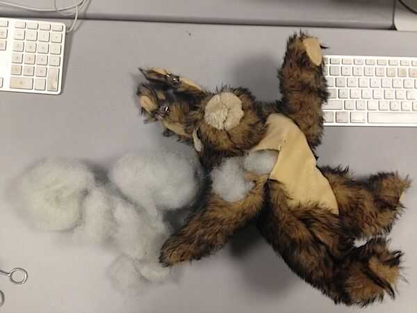 Ahora es el momento para poner el sistema de trabajo dentro del conejo. Hacer un agujero a lo largo de la costura en el pie derecho del conejo, luego sacar la mitad del relleno de cuerpo y todo el relleno principal. A continuación, corte un pequeño agujero en la nariz del conejo para el sensor de PIR, inserte el sensor de interior y cose en la nariz a través de 2 orificios laterales en el sensor.
