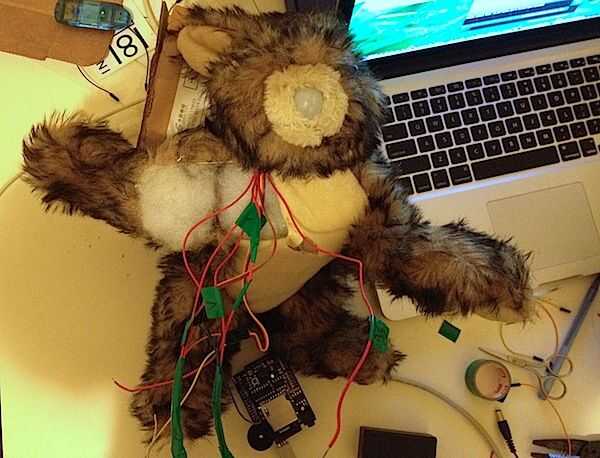 Lo más difícil es averiguar cómo asegurar dos servos dentro de la cabeza del conejo. La cabeza es muy suave y los servos tienen un par bastante alto. Cosió dos pajas a los ejes del servo a través de pequeños orificios en los ejes, luego utiliza algunos cartones y cinta de embalaje para unir todo. Inserta la paja en orejas de conejo y espera lo mejor.
