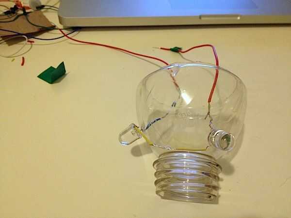 A continuación, cortar la parte superior de una botella de Gatorade vacía (será cráneo del conejo) y hacer dos agujeros para los ojos. Suelde el LED y el resistor de 1K como se muestra en la foto (etiqueta todo!) e inserte el conjunto del cráneo en la cabeza del conejo. Probar los LEDs cuando se instala por puentes de conexión a los pines correspondientes en el protector de la onda y ejecuta el bosquejo;
