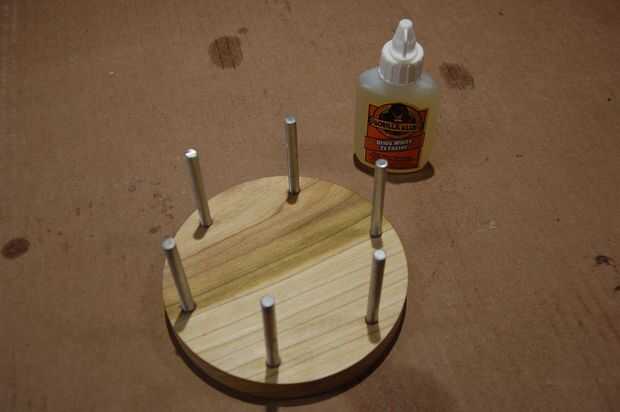 Para fijar las barras en el disco de fondo (Asegúrese de que no agarre la parte superior), utilicé pegamento gorila. Traté de superglue, pero no sostener. Epoxy también no tienen... y para mi sorpresa, tampoco pegamento de construcción resistente. Algunos del pegamento gorila ampliaron hasta por los orificios, pero ser eliminado fácilmente con una cuchilla de utilidad y suave cojín que pulimenta.